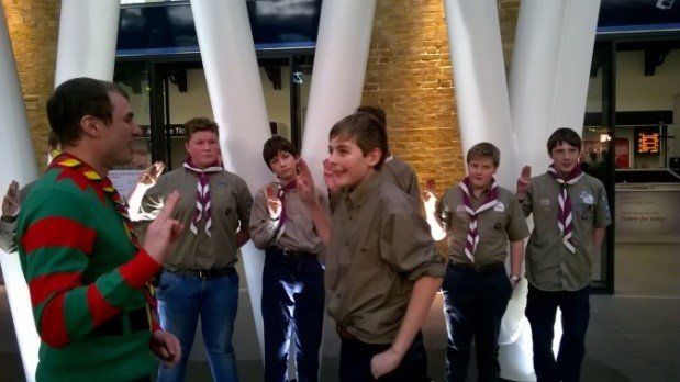 In December Viking Explorers traveled by train to London to stay for a weekend at Gilwell Park. We visited the Winter Wonderland at Hyde Park, the Imperial War Museum and Hamleys toy shop. Unfortunately we didn’t get our trip over the Thames on the cable car due to high winds. Back at Gilwell after a yummy tea we tackled the high ropes course. On the Sunday morning we invested our newest member, James, at Kings Cross Station. Two of our meetings have been spent fund-raising, with a BBQ stall at the Caistor Christmas lights switch-on and an internationally themed quiz night.